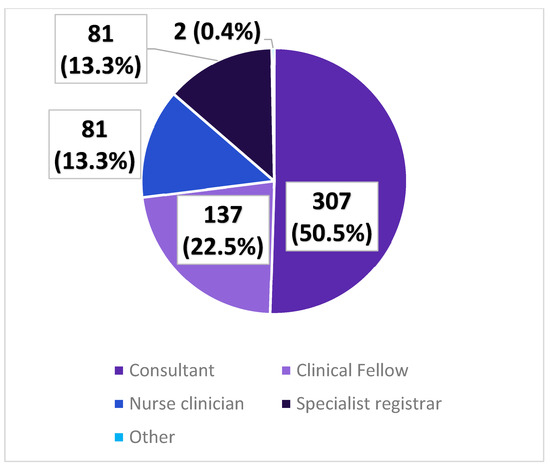 The distribution of clinicians completing the Cancer Oncology Group form at first clinic appointment.
