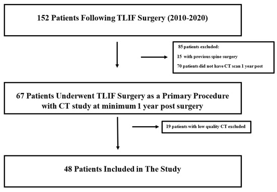 All patients who underwent TLIF surgery between the years 2010 and 2020 with post-operative computed tomography (CT) study at a minimum of 1 year following surgery were identified using specific International Classification of Disease 9th revision (ICD-9) procedure codes. Patients below 18 years of age and/or with previous spine surgery were excluded. Patients with a history of malignancy, radiation exposure, or chemotherapy were excluded. Moreover, low quality CT studies were excluded (Figure 1).