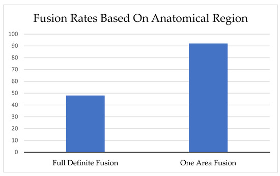 Full definitive fusion in both posterolateral and intervertebral body areas was observed in 48% (23/48) of patients, with 92% (44/48) achieving definitive fusion in at least one area (Figure 3). When comparing the fusion rates between posterolateral and intervertebral body areas, a significant higher definitive fusion rate was demonstrated in the posterolateral area compared to the intervertebral body area (92% vs. 52%, p < 0.001). Conversely, a higher probable fusion rate was demonstrated in the intervertebral body area compared to the posterolateral area (42% vs. 8%, p < 0.001). Additional information is presented in Table 1.