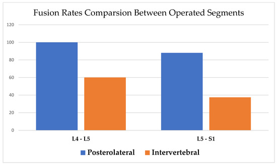 Stratifying the results pertaining the specific fixated segment showed similar fusion rate trends, with increased definitive fusion rate in the posterolateral area compared to the intervertebral body area (L4–L5: 100% vs. 60%, and L5–S1: 88% vs. 37.5%, p < 0.001) (Figure 4). In the multivariable analysis, accounting for the number of fixated segments and cage size, the results remained statistically significant (odds ratio (OR) = 15.9, 95% CI, 1.02 to 247.3, p = 0.048) (Table 2).