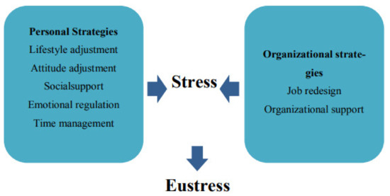 Understanding how stress affects one’s performance is essential for managing stress. Being self-aware and able to identify the signs of stress enables us to channel it positively and avoid its negative effects. However, no particular approach can be adopted to manage stress because stressors vary; however, Nahavandi et al. [81] identified two broad approaches to stress management in healthcare organizations. The first is the personal strategy and the second is the organizational strategy of stress management. Figure 1 demonstrates the approaches suggested by Nahavandi et al. [81].