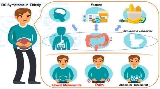 Functional gastrointestinal disease (FGID) is characterised by chronic or recurrent gastrointestinal symptoms, the absence of organic lesions on laboratory examination, and symptomatic dysfunction [1]. FGIDs include irritable bowel syndrome (IBS), functional bloating, constipation, diarrhoea, and unspecified available bowel disease [1,2,3]. Symptoms of IBS, the classic FGID, include abdominal pain, discomfort, and associated bowel abnormalities [3]. The mechanism of development of irritable bowel syndrome is illustrated in Figure 1. Physical and mental stress play a major role in the onset of IBS and the worsening of symptoms. The disease is etiologically based on an individual’s innate personality or the environment in which the individual grew up, which could cause the intestines to become sensitive. When physical and mental stress is added to this situation, intestinal dysfunction occurs. The intestines become spasmatic and contract excessively or become unable to relax, causing abnormal movement. Additionally, the brain and intestines become sensitive, causing sensory abnormalities. Symptoms of hypersensitivity syndrome are thought to arise from abnormalities in movement and sensation [1,2,3]. Rome IV diagnostic criteria are used to diagnose IBS [4]. According to the Rome IV diagnostic criteria, IBS is characterised by bowel or bowel-frequency-related abdominal pain occurring at least one day per week for the past three months. In addition to the persistence of symptoms for six months, two or more of the above three items associated with changes in stool shape can be used to diagnose IBS patients [4].