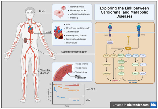 The close link between metabolic diseases, such as obesity and diabetes mellitus, and cardiorenal disease can be attributed not only to direct risk factors, such as hypertension, but also to the intricate interplay of various pathophysiological processes. These metabolic conditions contribute to the development and progression of cardiorenal diseases through multiple mechanisms, including the activation of pro-inflammatory and pro-atherogenic pathways mediated by oxidative stress and inflammation [1,2] (Figure 1). When examining this relationship, chronic kidney disease (CKD) itself can foster a pro-inflammatory state characterized by increased oxidative stress and insulin resistance. As CKD progresses, it disrupts normal metabolic processes, ultimately leading to an elevated risk of cardiovascular events and mortality [3]. Thus, gaining a comprehensive understanding of the kidney–heart axis and its associated alterations becomes paramount in effectively managing and addressing the cardiorenal complications stemming from CKD. By delving deeper into the intricate connections between the kidney and heart, medical professionals can implement more accurate and proactive approaches to patient care.