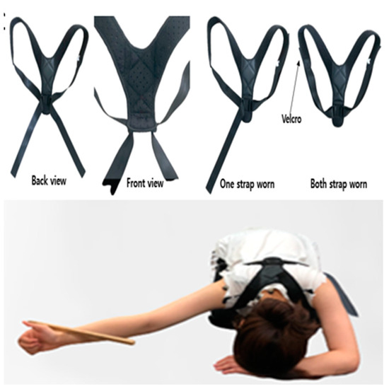 The principal investigator created an X-shaped strap using an X-shaped clip on the back of the underwear strap. The connection method is as follows. It starts at the anterior hook of the underwear, passes through the coracoid process, connects in an “X” at the upper thoracic level, passes through the clip, and connects to the posterior hook of the underwear (Figure 1). This X strap can bring about muscle contraction and correction of rounded shoulders using a clip in the middle of the back and elastic underwear straps. Once the brace was donned, the patients commenced their exercise routine. The exercise began in a quadruped position, and then they transitioned into a deep kneeling position for a duration of 3 s. During this exercise, the investigator elevated the patients’ shoulder to an abduction angle of 145°. Patients were directed to raise their dominant arm, maintaining an extended elbow, a forearm in a neutral position, and an extended hand. The wrist’s radial border made gentle contact with a wooden target bar without applying any pushing force. The target bar, set at the level of the patients’ earlobe line while in the deep kneeling position, was utilized to regulate the extent of shoulder flexion during each repetition of the rocking exercise [31].