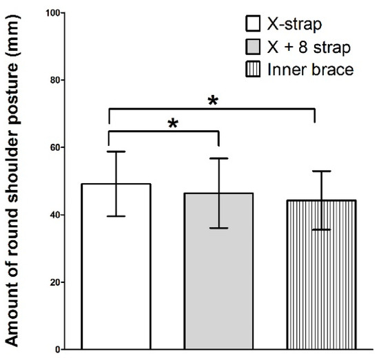 A comparative graph of round shoulder posture amounts among three different wearable brassiere braces. X strap, scapular posterior tilting exercise after applying the X-figure strap. X + 8 strap, scapular posterior tilting exercise after applying the X strap and figure-8 strap. Inner brace, scapular posterior tilting exercise after applying the inner brace. * p < 0.05.