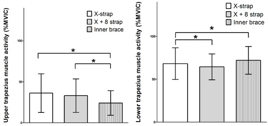 A comparison graph of muscle activities among three different wearable brassiere braces. % MVIC, percentage of maximal voluntary isometric contractions. X strap, scapular posterior tilting exercise after applying the X-figure strap. X + 8 strap, scapular posterior tilting exercise after applying the X strap and figure-8 strap. Inner brace, scapular posterior tilting exercise after applying the inner brace. * p < 0.05.