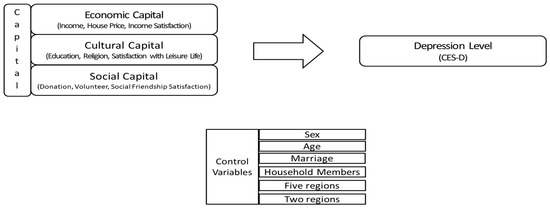 In addition, the main argument in Billings & Moos (1982), Lam et al. (2020) and Shu-Lin Shi (2020) is that environmental resources such as neighborhood attributes play a significant role in determining an individual’s health and well-being [7,50,51]. Kim et al. (2021) also explore the impact of the proximity of resources available in the area where older adults reside on depression and identify the resources that play an important role in reducing or preventing depression among older adults in a Korean context [15]. The relationship between urban–rural disparity and mental health also represents an important research topic in China. According to Zhang (2018) and Li (2021), informal family care is very important in determining the physical and mental health of the elderly, especially for those residing in rural areas [52,53]. The presence of more acute physical and mental health needs in rural areas in China is strongly determined by the accessibility of medical services as well [54]. Therefore, this study aims to examine the effect of capital on depression among the elderly in Korea (see Figure 1).