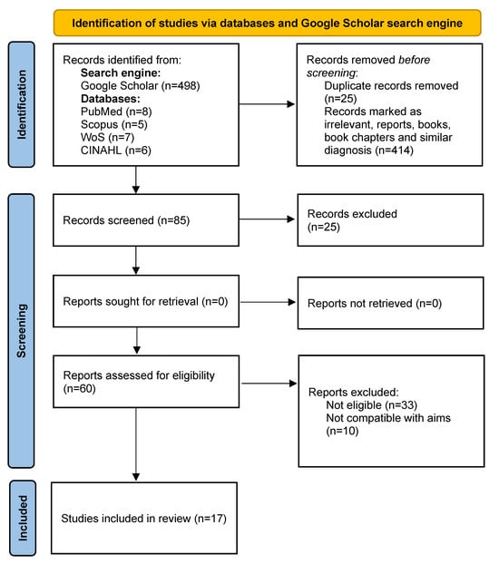 The search results for the Google Scholar search engine and diverse databases are shown in Figure 1. The initial evaluation of the results from each search engine was as follows: Google Scholar (n = 498), PubMed (n = 6), Scopus (n = 8), Web of Science (n = 7), and CINAHL (n = 9). Regarding our findings from the Google Scholar search, we had to evaluate every abstract to identify the most reliable and relevant papers since the number of published papers with the same diagnosis was high. Therefore, the removal of studies was conducted in two phases. In the first phase, clear medical conditions such as brain injury were evaluated, and relevant papers were moved to the second phase while the remaining papers were removed. Of a total of 524 papers, duplicates and irrelevant papers were removed to yield the 17 final papers included in the review. These papers represented the sum of papers illustrating the current landscape of medical challenges for military service members. Figure 1 shows the result of the literature selection according to the PRISMA flow chart. Table 2 shows a summary of the selected literature that was included in this study. Most of the studies were narrative reviews (n = 11), a few were systematic reviews, one was a randomized trial, one was registry-based, and another was a comparative study. Consequently, the evidence-based quality of the included 17 studies differed and did not allow a proper assessment (Appendix A).