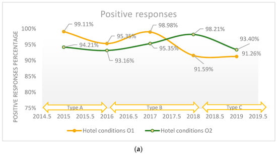 Hospital hotel conditions refer to accommodation (lounge, equipment, furniture, linen, cleanliness, hospital effects, facilities, temperature), cleanliness, and food; experts consider that these factors include elements related to the economy, culture, security, public welfare services, clinical care services, patient referral, and staff identification [50]. In the study conducted, the degree of patient satisfaction with hotel conditions is high, with a slight decrease in 2019 compared to previous years. Although there were no essential interventions on hotel conditions, a possible explanation for the decrease in patient satisfaction could be the improvement of the assessment methodology, with an emphasis on cleanliness and food, where lower scores were obtained.