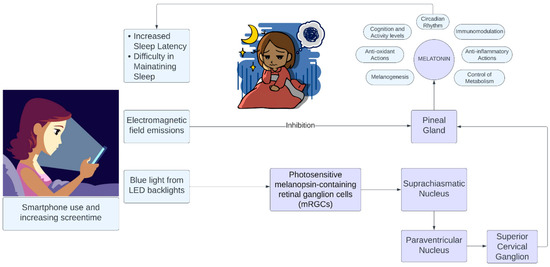 Smartphones utilize light-emitting diode (LED) backlights to enhance daytime brightness and contrast. The specifics of the light source used as the backlight will define the properties of the light emitted from a given smartphone [25]. Polychromatic “white” LEDs are routinely generated by fusing a blue LED with a yellow phosphor. This creates a light that appears white but possesses a spectral distribution that peaks in the blue segment of the electromagnetic spectrum [17]. The emitted blue light commonly has a wavelength close to the peak sensitivity for non-visual circadian photoreception. Chronic exposure to such blue light, even at low intensities, is considered to be above the predicted threshold for melatonin suppression. This, consequentially, likely disrupts the circadian rhythm, thereby potentially influencing a wide array of health outcomes: alertness, cognition, sleep, and activity levels (Figure 1) [12,13,14].