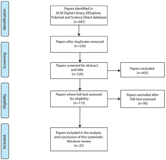 This section presents the results obtained from the systematic literature review. The selection and filtering process is presented in Figure 2. As shown, our initial search yielded a total of 681 items, which became 520 after the duplicates were removed. After reviewing title and abstract to eliminate studies that did not meet the inclusion/exclusion criteria, 405 articles that did not meet the criteria were removed from the corpus. Subsequently, 115 articles were assessed for eligibility through full-text analysis, and finally, 25 publications met the inclusion criteria.