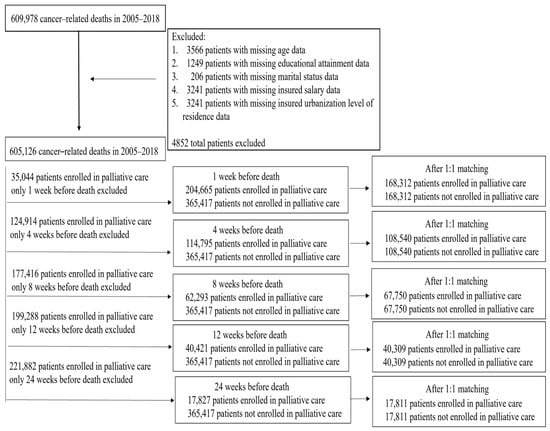 This was a retrospective cohort study that utilized data from the National Health Insurance (NHI) Research Database maintained by Taiwan’s Ministry of Health and Welfare from 2005 to 2018 in addition to data on cause of death. Deceased patients whose primary and secondary causes of death were cancer were included. Cancer is defined as the first three characters for categories 140–208 in the ICD-9-CM codes and the first three characters for categories C00-C97 in the ICD-10-CM codes. There were 609,978 deaths diagnosed as cancer (D-code: 140–208, ICD10: C00-C97) between 2005 and 2018. After excluding 11,503 cases with incomplete data on age (3566), marital status (206), monthly salary (3241), education level (1249), and urbanization level of resident area (3241), 605,126 cases were included in the study. Figure 1 presents a flowchart of the selection process.