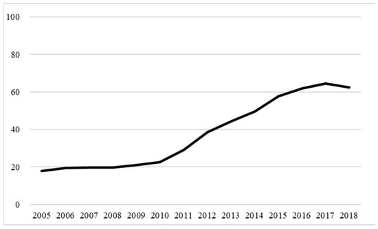 Trends in the percentage of terminal cancer patients enrolled in palliative care before death, 2005–2018.