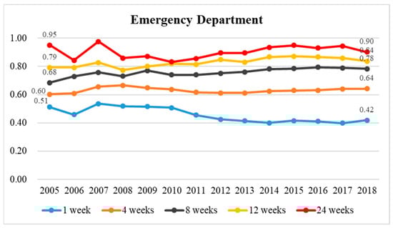 Next, the utilization rates of the two groups were compared each year to observe the trends (Figure 3, Figure 4, Figure 5 and Figure 6 and Supplementary Tables S7 and S8). Figure 3 shows that the ratio of emergency care utilization between the two groups had different yearly trends depending on the duration of palliative care before death. The ratio of those enrolled to those not enrolled at 1 week before death was level at 0.46–0.54-fold in 2005–2010, steadily decreasing to 0.40-fold in 2010–2018 (Supplementary Table S7). This is largely due to a large yearly increase in emergency care utilization among those not enrolled in 2005–2018. The ratio of utilization rates for those enrolled at 4, 8, and 12 weeks before death to those not enrolled increased steadily in 2005–2018, which was primarily due to a yearly increase in emergency care utilization among those not enrolled in 2005–2018. The ratio of utilization rates for those enrolled at 24 weeks before death to those not enrolled decreased slightly in 2005–2010 to a minimum in 2010 (0.83) and then gradually increased to 0.90-fold in 2011–2018, a trend that was largely due to a similar increase in emergency care utilization among both those enrolled and not enrolled in 2005–2018 (Supplementary Table S7).