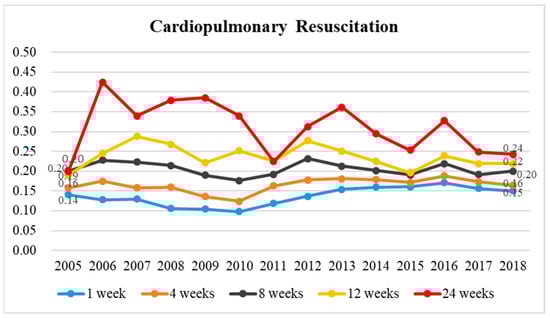 The rate of CPR utilization among enrolled patients at 1, 4, and 8 weeks before death exhibited a steady decrease in 2005–2010 and an increase in 2010–2018 compared to that of those not enrolled (Figure 4). This is primarily due to the decrease in CPR utilization in both groups in 2005–2010, which was lower among the enrolled group compared to the unenrolled group (Supplementary Table S7). The rate among those enrolled at 12 and 24 weeks before death exhibited a steady increase in 2005–2010 and a decrease in 2010–2018 compared to that of those not enrolled; this is primarily due to higher CPR utilization among those enrolled in 2005–2010 (Supplementary Table S7).