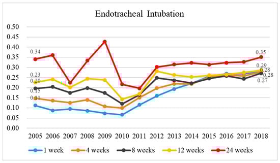 The rate of intubation among those enrolled at 1, 4, 8, 12, and 24 weeks before death decreased over time in 2005–2010 compared to that of those not enrolled (Figure 5); however, the rate of intubation among the two groups increased over time in 2010–2018. However, the decrease in intubation rates was larger in the enrolled group; in 2010–2018, intubation rates decreased for the unenrolled group and increased for the enrolled group (Supplementary Table S8).