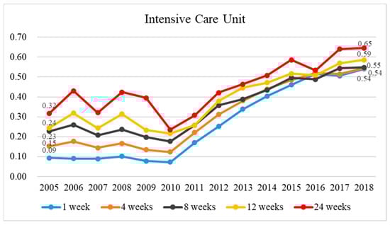 The rate of ICU admission for enrolled group at 1, 4, 8, 12, or 24 weeks before death decreased over time in 2005–2010 compared to that of those unenrolled group (Figure 6). In 2010–2018, the rates of ICU admission increased in both groups. This change is primarily due to changes in ICU admission among those enrolled in palliative care, which increased annually from 2010 to 2018 (Supplementary Table S8).
