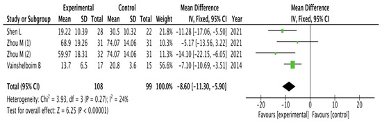 The pooled mean difference showed a significant overall effect of chest physiotherapy interventions in the experimental group compared to the control group (MD = −8.60, 95% CI = −11.30, −5.90; p < 0.00001). The results showed low heterogeneity and a significant variability of I2 = 24% not attributable to chance.