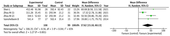 The results obtained for exercise capacity were analyzed as shown in Figure 3. The pooled mean difference showed a significant overall effect of chest physiotherapy interventions in the experimental group compared to the control group (MD = 37.62, 95% CI = 15.10, 60.13; p = 0.001). The results showed heterogeneity and a variability of I2 = 65% not attributable to chance. Because of the high heterogeneity, the sensitivity meta-analysis was carried out excluding the study by Zhou et al. (1) [31] due to its weight in the analysis. However, the statistically significant difference in favor of the experimental group was maintained (MD = 49.61, 95% CI = 32.84, 66.38; p < 0.00001)