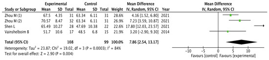 The results obtained for pulmonary function were analyzed as shown in Figure 4. The pooled mean difference showed a significant overall effect of chest physiotherapy interventions in the experimental group compared to the control group (MD = 7.86, 95% CI = 2.54,13.17; p = 0.004). The results showed heterogeneity and a variability of I2 = 80% not attributable to chance. Because of the high heterogeneity, the sensitivity meta-analysis was carried out excluding the study by Zhou et al. (1) [31] due to its weight in the analysis. However, the statistically significant difference in favor of the experimental group was maintained (MD = 9.36, 95%, CI = 1.75,16.98; p = 0.02).