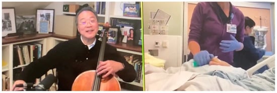 - Ambler, M.; Wodecki, L.; Amass, T. Virtual bedside concerts for patients with COVID-19: A trio of perspectives. CMAJ 2020, 192, E1370–E1371. [Google Scholar] [CrossRef]