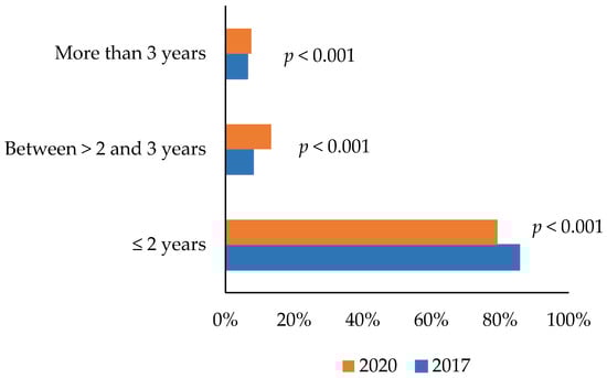 Of the total of women aged 50–69 years, 78% had received breast cancer screening in the previous two years. There was a significant decrease in mammography adherence during the previous two years in 2020 (79.22%) with respect to 2017 (85.59%) (p < 0.001). Moreover, the percentage of women who attended the screening between >2–3 years (2017: 8.04%, 2020: 13.29%, p < 0.001) and more than 3 years (2017: 6.36%, 2020: 7.49%, p < 0.001) was lower in 2017 than in 2020 (Figure 1).