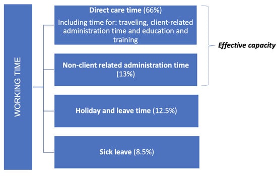 In the context of capacity planning, non-direct care activities should be taken into account for the working time of the care workers (e.g., []). Regarding the division of working time, we use the classification as presented in Figure 1. The percentages that correspond to the categories ‘non-client related administration time’, ‘holiday and leave time’, and ‘sick leave’ are according to the studies [,,], respectively.