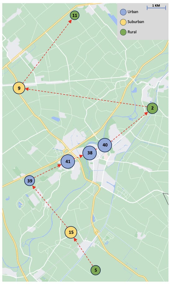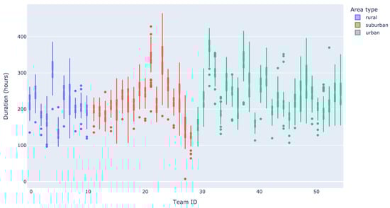 Our partner HHC provider provides home, residential, custodial, personal, and informal care support to roughly 12,000 clients, with about 4000 employees (1600 FTE) and 1000 volunteers (2021 data). Regular home care is provided by a group of 55 teams. During the period 2020–2021, each team served 210 clients on average. The variation in client numbers across teams largely hinges on the intensity of care required by the clients and the population density of the relevant area. The total coverage area of the HHC teams is around 300 square kilometers. Table 1 provides an overview of the main characteristics per type of area (i.e., urban, suburban, and rural).