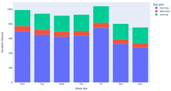 The total demand for care per weekday and for each part of the day is visualized in Figure 3. The demand over the course of the week is rather stable, with a decrease in demand during the weekend of about 19.3% compared to the weekdays. The differences in demand across the day are more noticeable. The vast majority of care is taking place in the morning (68.6%), followed by the evening (24.2%). Only 7.3% of the demand is provided during the afternoon. This uneven distribution of demand across the day may complicate the deployment of care workers, as we will demonstrate in Section 3.2.5.