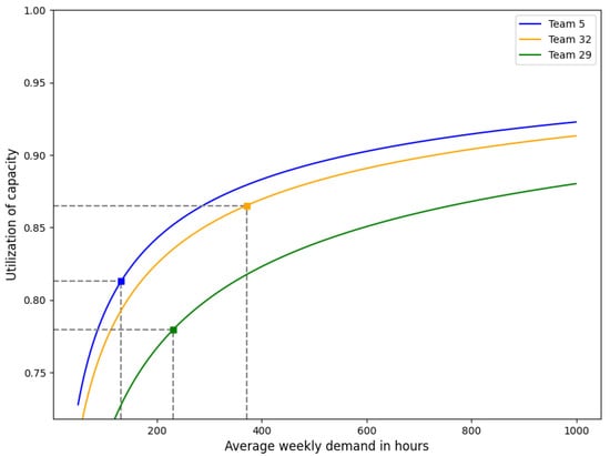 In Figure 4, the utilization of capacity is illustrated as a function of the average weekly demand in hours. This illustration is based on teams 5, 29, and 32, which were chosen based on their features depicted in Figure 2. In particular, team 5 is characterized by a relatively low volume of weekly demand () and low variability (). Team 29 exhibits a moderate volume of weekly demand () but experiences substantial variability (). Finally, team 32 has a high volume of weekly demand () and a moderate level of variability (). For the three lines in Figure 4, the peakedness is held constant whereas average weekly demand varies. For each team, the utilization of capacity is marked for their current weekly demand and peakedness on the respective graph. As can be observed, the utilization of capacity increases with the average weekly demand, albeit at a decreasing rate, demonstrating economies of scale and the law of diminishing returns. This effect appears when comparing teams 5 and 32 since the utilization of capacity of team 32 is significantly higher than for team 5 due to a larger volume of weekly demand (whereas the peakedness is somewhat comparable). Although team 29 also has a larger volume of weekly demand than team 5, its utilization of capacity is lower due to the relatively high peakedness. This demonstrates that reducing the variability in weekly demand can also increase the utilization of capacity. Overall, we see that an average demand of at least a couple of hundred care hours per week seems desirable for an efficient HHC operation. This exceeds the current size of most teams.