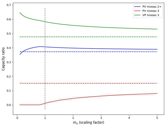 Here, the peakedness z represents the variability in demand that results from variability in the arrival process, LoS, and case demand per week. To be precise, . Observe that the first term in (9) ensures that the capacity is sufficient to handle the load on average, whereas the second term represents the safety capacity required to cover the variability in demand (in particular, the standard deviation of N is ). Hence, the safety capacity only grows with the square root of the offered load, providing opportunities for economies of scale.