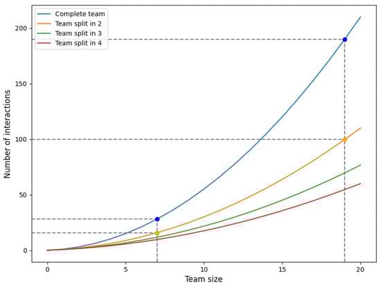 (Communication and management). The complexity of managing a team increases rapidly with team size due to the number of possible interactions between team members. The complexity can be mitigated by splitting the team into smaller flexible sub-teams coordinated by a central managing post.