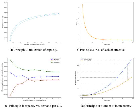 The effects of Principles 1, 3, 4, and 6 are illustrated at each step in the merging process in Figure 10; starting from the left, each point indicates that another team is added to the cluster. Here, Figure 10a shows the utilization of capacity , Figure 10b the probability that effective capacity falls below 60%, and Figure 10d the number of interactions within the team. Moreover, Figure 10c shows the difference between the capacity and demand ratio for each QL k, , which is ideally just above zero for every QL. From the figures, we observe that there is a considerable improvement in capacity utilization, the risk reduction in shortage in effective capacity, and the capacity deviations in the first few steps of the merging process. However, the improvements diminish significantly following subsequent merging steps. Roughly, most of the improvements have been achieved after four teams have been merged, i.e., teams 5, 15, 39, and 41, corresponding to a total aggregate of almost 800 care hours per week. Moreover, the number of interactions is already significant for the combination of the four teams. This can be partly mitigated by splitting the combined team into two flexible sub-teams managed by a central post (yellow line in Figure 10d).