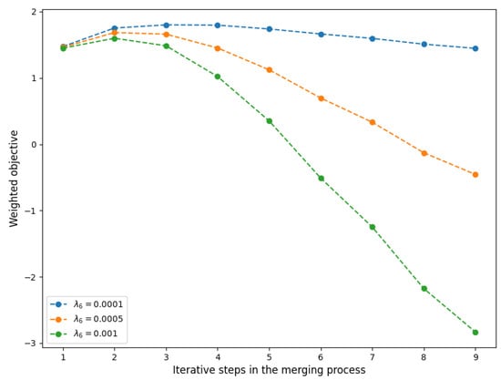 The observation above intuitively indicates that merging teams 5, 15, 39, and 41 may produce an appropriate balance between efficiency and manageability. However, such decisions depend on the relative importance of the individual components. To formalize this idea, we consider the following weighted objective function that needs to be maximized: