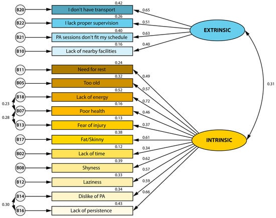Descriptive statistics are shown as means ± standard deviation or as percentages (frequencies), and normality was tested using the Shapiro–Wilk test. Perceived barriers to PA latent factor validity were psychometrically tested, performing a Confirmatory Factor Analysis. Full Information robust Maximum Likelihood was used to handle the small amount of missing data at the item level (missing at random = 3%) as proposed by a previous study [42]. The hypothesized model was tested using Amos 23.0 following the previous recommendations [43]. The absolute fit of the models was evaluated using the chi-square by degrees of freedom ratio (χ2/df), and the Standardized Root Mean Square Residual (SRMSR), while the relative fit was assessed using the Normed Fit Index, the Tucker–Lewis Index, and the Comparative Fit Index. For these indices, values over 0.95 indicate a good fit, and values over 0.98 of a very good fit [44]. A value lower than 0.08 for SRMSR is considered acceptable [45]. The Root Mean Square Error of Approximation (RMSEA) was used for evaluating how well the implied model reproduced the variance-covariance matrix of the data, keeping in mind that RMSEA values as low as 0.08 are deemed adequate, and below 0.06 represent a good fit to the model [45]. Then, the extracted factors were used in a multiple regression analysis with stepwise variable selection to identify the PA predictors [42].