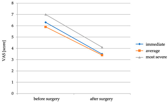 It was found that 29 patients (80.5%) experienced a reduction in LBP with sciatica pain (difference in VAS scores before and after the procedure). In 29 patients there was a reduction in the discomfort experienced in the period immediately after the procedure, 5 patients showed no improvement in this regard and 3 patients experienced an increase in pain. Twenty-nine patients experienced a decrease in the patient’s average pain intensity, three experienced no change in their average pain intensity and four experienced an increase in their average pain intensity. Twenty-nine patients experienced a decrease in LBP with sciatica described as the most severe pain experienced by the patient, five patients had no change in pain intensity and the remaining two patients experienced an increase in pain intensity. Four patients did not improve in one or two types of pain, whereas the other five did not improve in terms of the severity of all three types of pain. In one patient (outside the analyzed group of 36 patients with LBP with sciatica before surgery), a root syndrome from sciatic nerve compression appeared only after surgery. On average, there was a decrease in the severity of LBP with sciatica felt immediately after the procedure by 2.6 points on the VAS scale, the average pain felt decreased by 2.3 points and the most severe pain felt decrease by 2.6 points compared with the same parameters studied before the procedure.