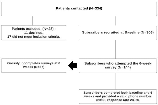 The data for this study was collected through REDCap [33] as part of a large ongoing trial assessing the utility of Text4Support and peer support in reducing inpatient readmission rates [26]. The eligibility criteria were a service user diagnosed with any mental condition, ready for discharge from an inpatient mental health unit, aged between 18 and 65, who had a mobile device, could read English text messages, and could provide informed written consent. Other essential data collected included sociodemographic information such as age, gender, ethnicity, educational level, relationship status, and employment status. Clinical information such as diagnosis and duration of the present admission of the service user were also collected. Recruitment for the randomized trial commenced in March 2022 and will be ongoing until March 2024. However, data for this sub-study was collected between 8 March 2022, and 31 May 2022, and all participants were in the control group of the randomized trial, receiving only the usual follow-up care post-discharge from the hospital. All study participants completed the baseline online survey with the assistance of a research team member after signing a paper-based consent form. They received a text message at six weeks post-discharge with a link to the follow-up survey. To maximize the response rate, a reminder text message was sent two days after the first follow-up text message was sent. Phone numbers were the primary identifier for the service users and were used to track the responses across the follow-up time points. Figure 1 represents the subscriber flowchart, which indicates the number of subscribers who completed the surveys at each time point of the data collection.