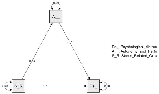 The mediation analysis results revealed important insights into the relationships between the variables of interest. Firstly, the direct effect of stress-related growth on psychological distress was found to be statistically non-significant (B = 0.101, SE = 0.091, z = 1.109, p = 0.268, 95% CI [−0.078, 0.281]), as depicted in Table 3. This direct relationship did not reach statistical significance (p = 0.26), as the 95% confidence interval included zero (Lower CI = −0.078, Upper CI = 0.281). This suggests that stress-related growth alone does not significantly predict psychological distress. However, the analysis revealed one marginal significant indirect effect, indicating that stress-related growth influences psychological distress through autonomy and performance deficiency schema.