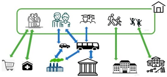 Illustration of a simplified model of multilayer catenary networks in the model. Individuals move between home, school, work, and the community throughout the day.