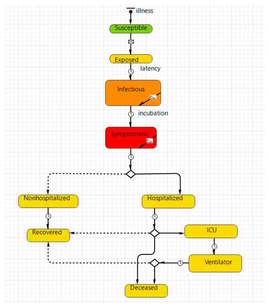 Agents move or stop according to their own trajectory. Once susceptible agents meet infectious agents and become infected, the state of susceptible agents changes to “exposed.” After a given “latent period,” those individuals become “infectious” and can infect other agents. COVID-19 symptoms appear during the incubation period after exposure. After diagnosis, some of the sick remain on outpatient treatment, are isolated at home, and recover soon. The remainder are sent to the hospital, where they might be moved to intensive care with artificial lung ventilation if conditions worsen. The outcomes for all patients are recovery or death. Once recovered, the agents can no longer be infectious and cannot be reinfected. We assumed this trend early in the pandemic when the risk of reinfection was low [48].