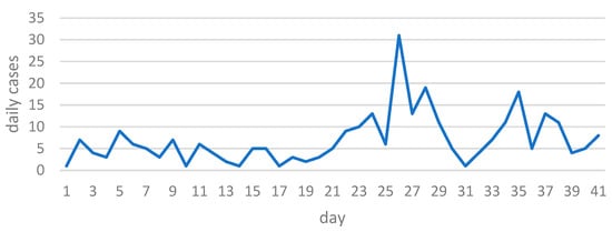 The epidemic rate depends on several factors. Mitigation measures are mainly aimed at restricting the number of contacts between contagious and susceptible people, as well as the probability of infection by contact. Factors affecting incidence include migration, quarantines, lockdowns, heterogeneous mixing of the population, insufficient testing, the presence of asymptomatic cases, the simultaneous presence of several strains, etc. Regular adherence to restrictive measures based on population segments is difficult to assess. In reality, however, the dynamics of infection differ from the classical epidemiological process. Transmission and contact rates are functions of time and have a stochastic character (Figure 3 shows a portion of the daily number of COVID-19 cases in Karaganda from 10 March 2020 to 19 April 2020).
