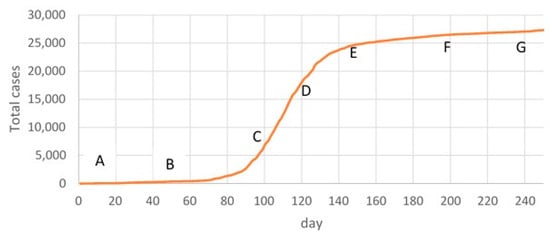 The first-time frame (AB) was 50 days, from 10 March 2020 to 30 April 2020. The second time frame (BC) was 50 days, from 01 May to 19 June. The third time frame (CD) was 20 days, from 20 June to 09 July. DE—30 days, from 10 July to 08 August; EF—50 days, from 09 August to 27 September; and FG—50 days, from 28 September to 16 November 2020.