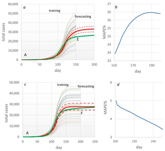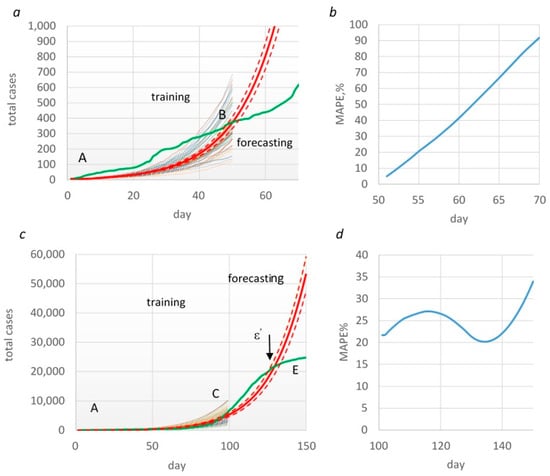 Long-term forecasting (up to 50 days) has produced satisfactory results for monotonic changes in this indicator. However, when inflection points appear on the “total number of cases” curve, relatively satisfactory results were obtained for short-term forecasting up to 10 days.