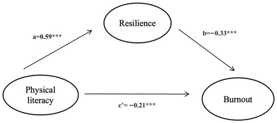 Graphical representation of the mediation model of resilience for physical literacy and burnout. *** p < 0.001.