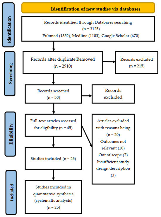 The three databases were used to search more than three thousand articles related to the topic of the study. The 3125 articles have been identified from the three databases with a composition of PubMed (1352), Medline (1103), and Google Scholar (670). Two-hundred fifteen articles were excluded because of the problem of duplication, and after the process of screening, 50 articles were selected after the elimination of the 2860 articles. After that, full-text articles were assessed, and a further 20 articles were excluded for a number of reasons, which include the outcomes being not relevant, out of scope, or insufficient study design description. At the final stage of the PRISMA, the 25 articles were finalized for the systematic review. The results of the preferred reporting items for the meta-analysis and systematic reviews have been presented in Figure 1.