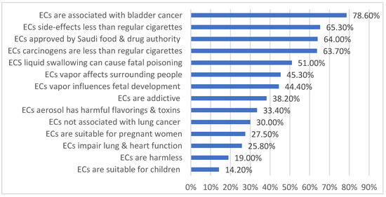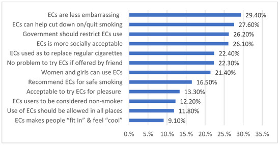 Fortunately, our studied population displayed a negative attitude towards EC use. However, more than a quarter of the participants believed that ECs can help people cut down on regular cigarettes or quit smoking. This finding/trend was also reported from different regional countries but to different extents, ranging from 20.2 to 69.1% [2,12,34]. We reported that male participants and smokers were more likely to have a positive attitude towards ECs, which was consistent with a recent Malaysian study published in 2021 [34]. This raised the alarm to target these population groups in any further plans to improve their behavior. However, older participants were less likely to show a positive attitude towards ECs.