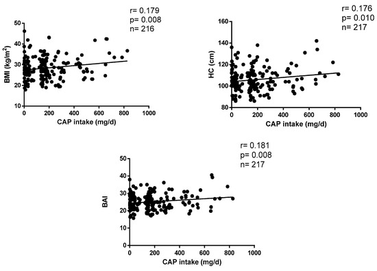 The correlations between CAP consumption and anthropometric parameters are plotted in Figure 1. CAP intake positively correlates with BMI (r = 0.179, p = 0.003), HC (r = 0.176, p = 0.004) and BAI (r = 0.181, p = 0.001) after adjustments by age, sex, appetite, calories, protein, fat and carbohydrate ingestion levels.