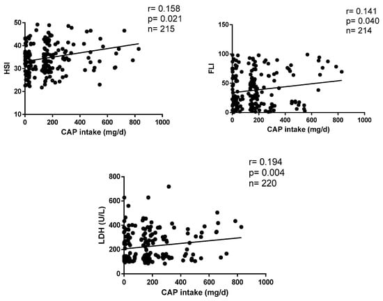 Figure 2 shows the correlations between CAP intake and metabolic markers of liver function. Daily CAP consumption positively correlates with HSI (r = 0.158, p = 0.004), FLI (r = 0.141, p = 0.003) and LDH (r = 0.194, p = 0.016) after statistical settings (Figure 2).