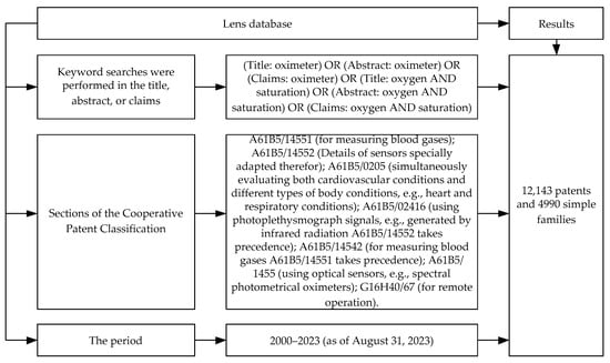 The research information base was an array of patent documents issued for the period of 2000–2023 (as of 31 August 2023), presented in the Lens database. To analyze patents reflecting the main trends in technical solutions in the field of pulse oximeters, a search was conducted using the following keywords “oximeter” and “oxygen saturation”, using the OR operator. The request was limited to the sections of the Cooperative Patent Classification.