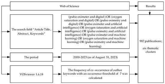 For the bibliometric analysis of scientific publications on pulse oximetry, the Web of Science database was used. The period of 2000–2023 (as of 31 August 2023) was also selected as the time interval for the analysis. In order to assess the prospects for using digital technologies in combination with pulse oximeters, the keywords “pulse oximeter”, “oxygen saturation”, “pulse oximetry”, “digital”, “artificial intelligence”, and “machine learning” were used to search. The search field “Article Title, Abstract, Keywords” was used. The procedure for defining documents for bibliometric analysis is shown in Figure 2.